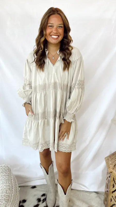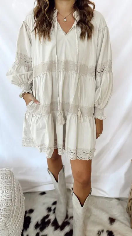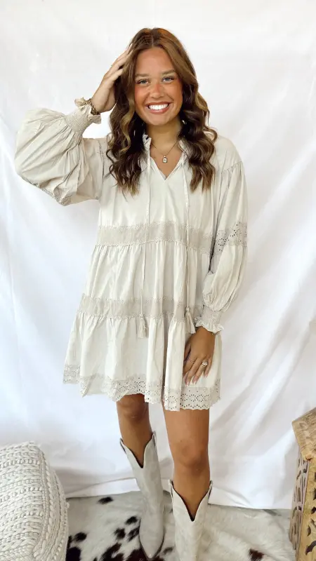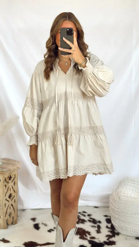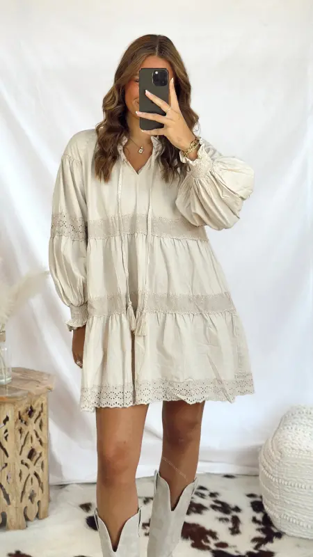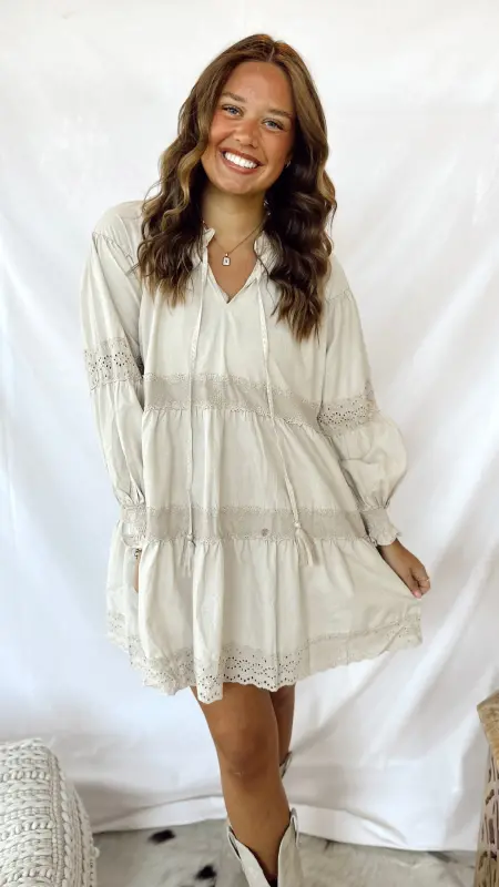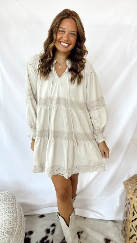 The Evie Dress is a light tan long-sleeved dress featuring charming eyelet details for a playful touch. Perfect for casual days or a relaxed outing, it combines comfort and style effortlessly. Easy to dress up or down, this dress brings a breezy, fun vibe to your wardrobe.
