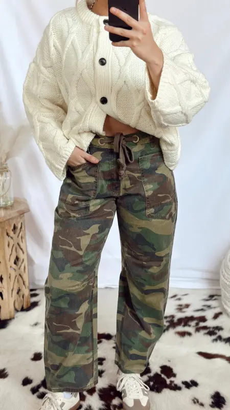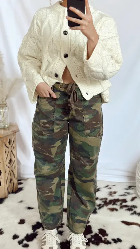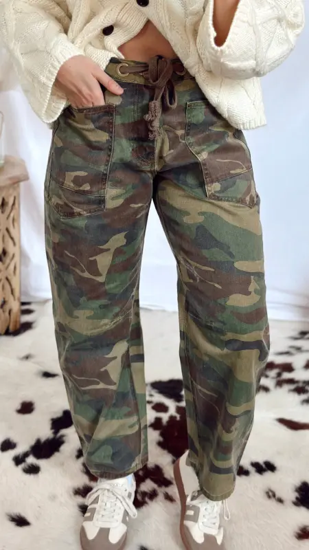 Camouflage jeans with rope tie waist.
