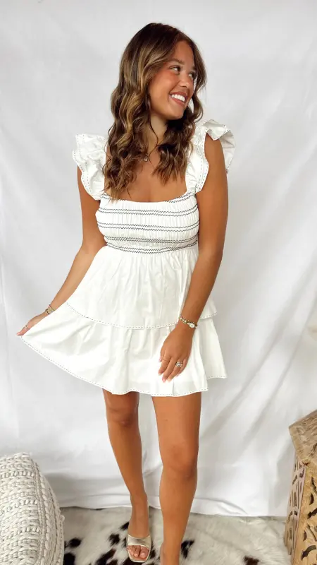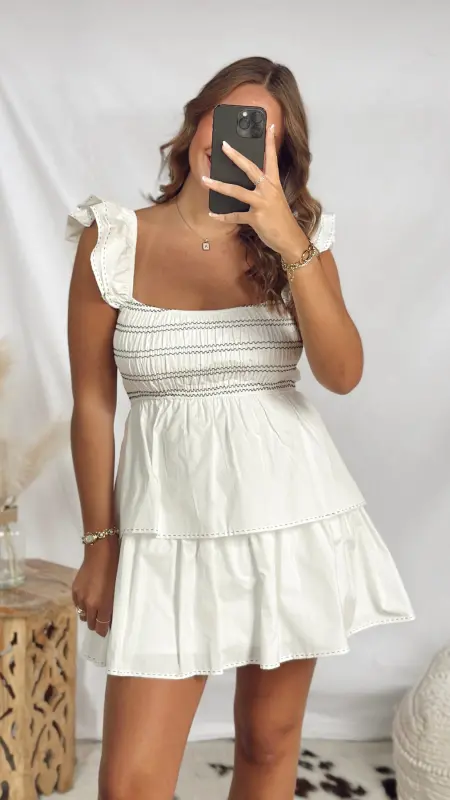 The Sammie Dress shines with its crisp white fabric accented by bold black stitching, adding a modern twist to its smocked top and ruffle sleeves. This fun and easy-to-wear dress is perfect for making a stylish statement wherever you go.